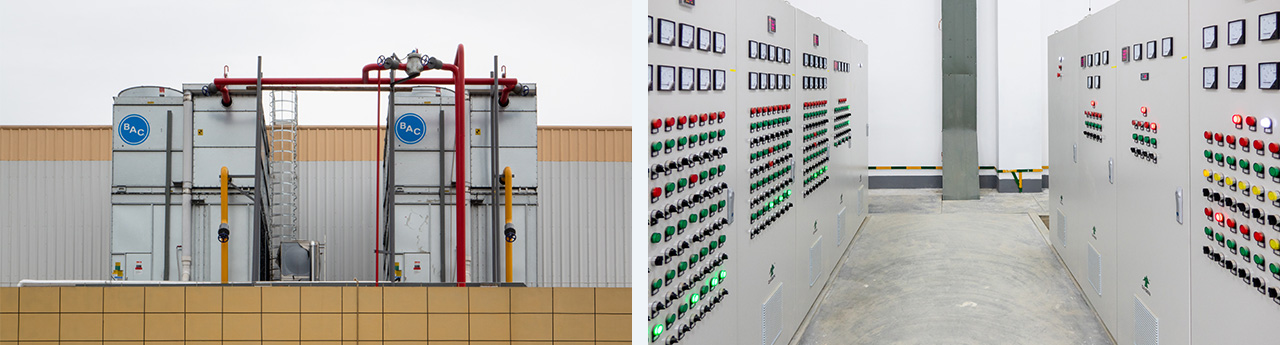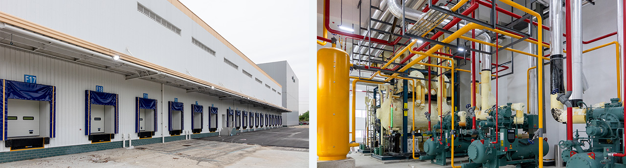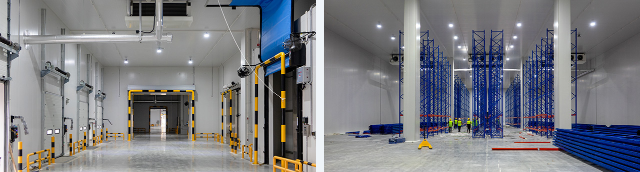 建筑面積108000m2。分為6間高低溫兩用庫(-20°C/-5°C)及南北兩個(gè)月臺(tái)。低溫存儲(chǔ)1萬噸,高溫5500噸,。山綠集團(tuán)全自動(dòng)智能低溫5#車間設(shè)計(jì),采用氟(R507A)及二氧化碳(R744)載冷式制冷系統(tǒng)。末端設(shè)備采用吊頂式冷風(fēng)機(jī),水沖霜。