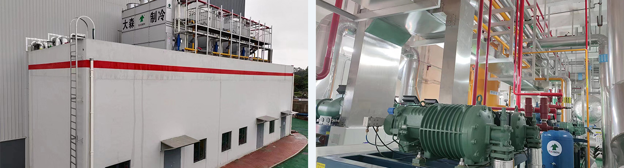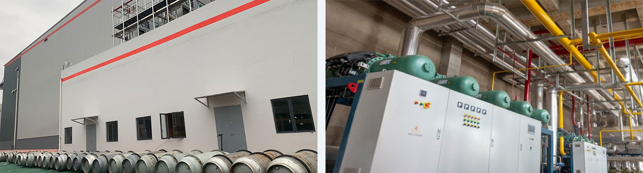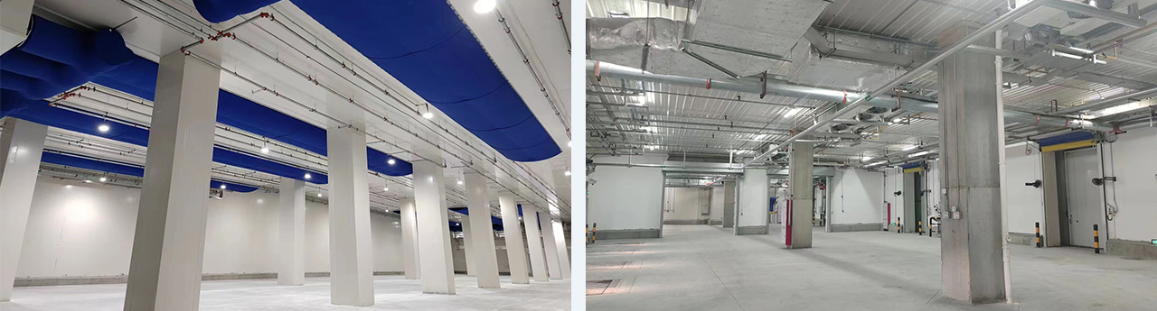 1座1層鋼結(jié)構(gòu)冷庫,層高11米。地塊總用地面積約 64351.57 ㎡,本單體庫包含1間凍結(jié)物冷藏間,1間變溫冷藏間以及控溫穿堂;若變溫冷藏間作為凍結(jié)物冷藏間使用時(shí);凍結(jié)物冷藏間總噸位:9084t,若變溫冷藏間作為冷卻物冷藏間使用時(shí):凍結(jié)間冷藏間總噸位:4542t;冷卻物冷藏間總噸位3633t。本項(xiàng)目采用氟利昂(R507)制冷系統(tǒng);桶泵供液,熱氣融霜系統(tǒng)。末端設(shè)備均采用吊頂冷風(fēng)機(jī),配置織物風(fēng)道送風(fēng)系統(tǒng),采用熱氣融霜。自動(dòng)化調(diào)節(jié)高低溫。