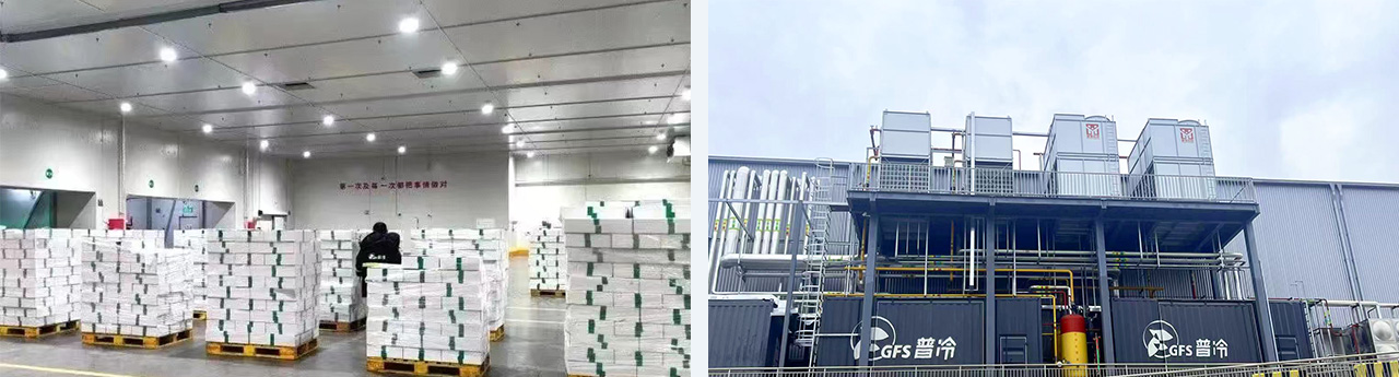 位于廣西南寧市,2間凍結物冷藏間,2間冷卻物冷藏間,1間變溫庫。低溫存儲7700噸,高溫存儲3200噸。3500平低溫穿堂2-7℃,采用的R507直膨制冷,熱氣融霜。